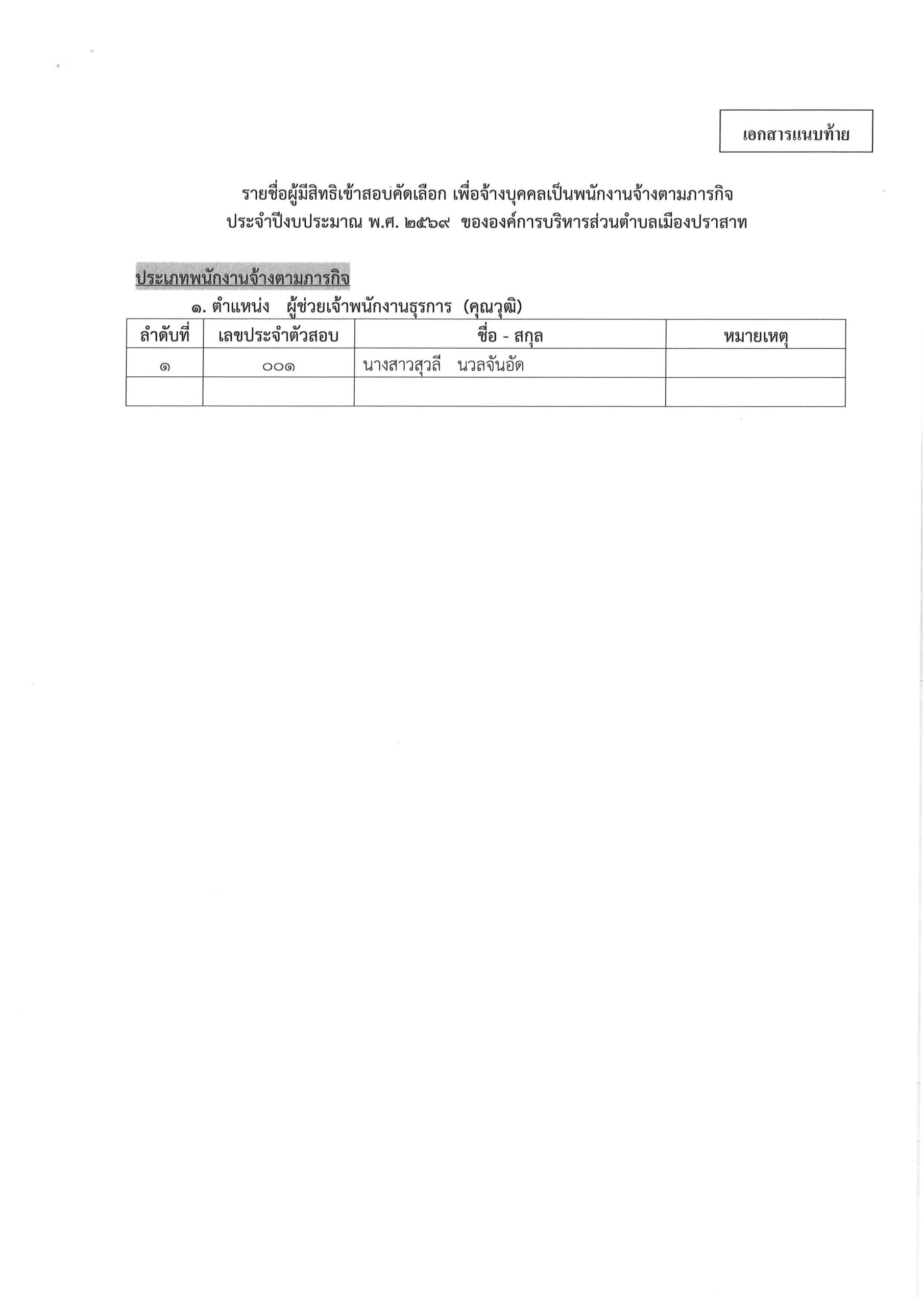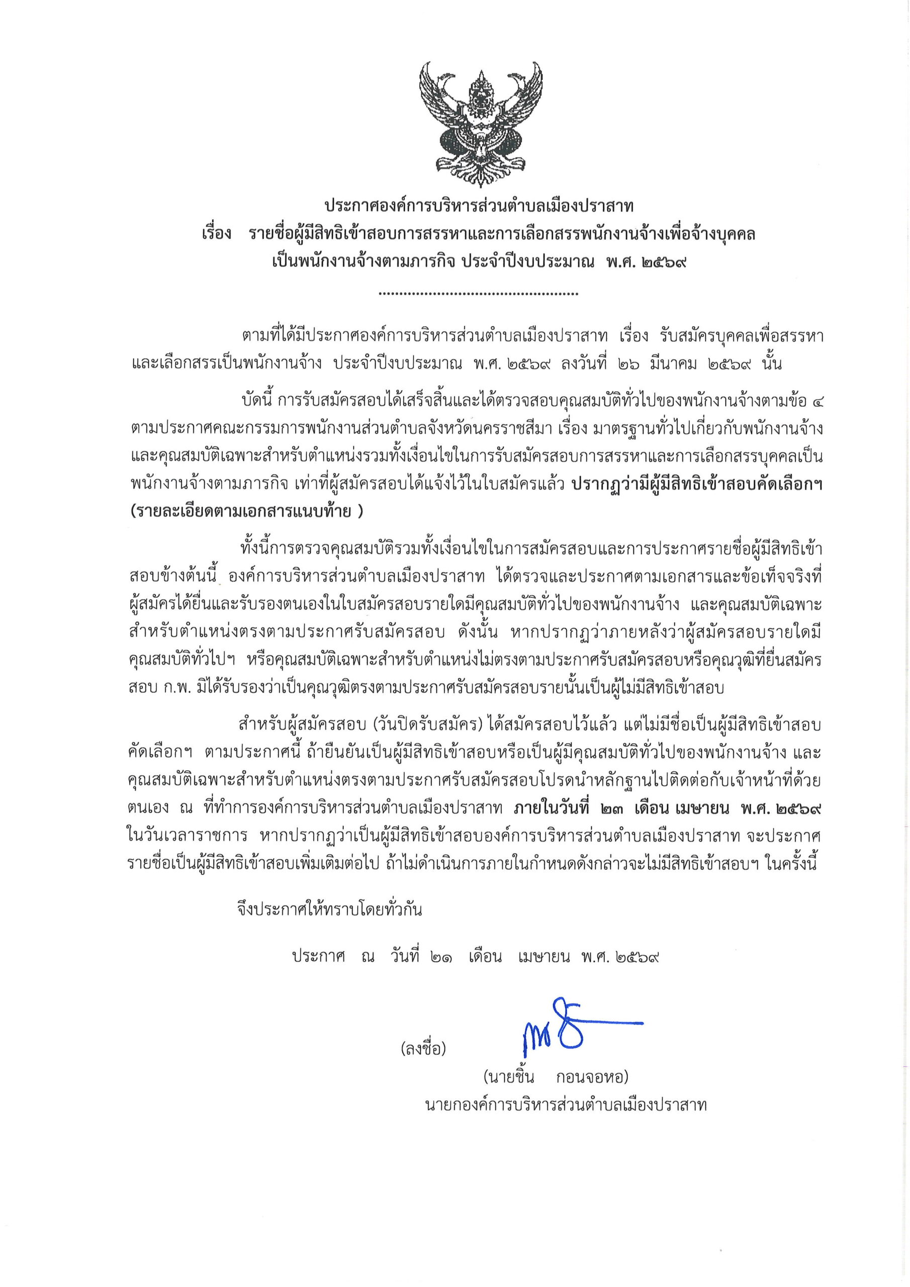 ประกาศ เรื่อง กำหนดวัน เวลา สถานที่สอบ และระเบียบเกี่ยวกับการสอบการสรรหาและการเลือกสรรพนักงานจ้างเพื่อจ้างบุคคลเป็นพนักงานจ้างตามภารกิจ ประจำปีงบประมาณ พ.ศ.2569 ขององค์การบริหารส่วนตำบลเมืองปราสาท